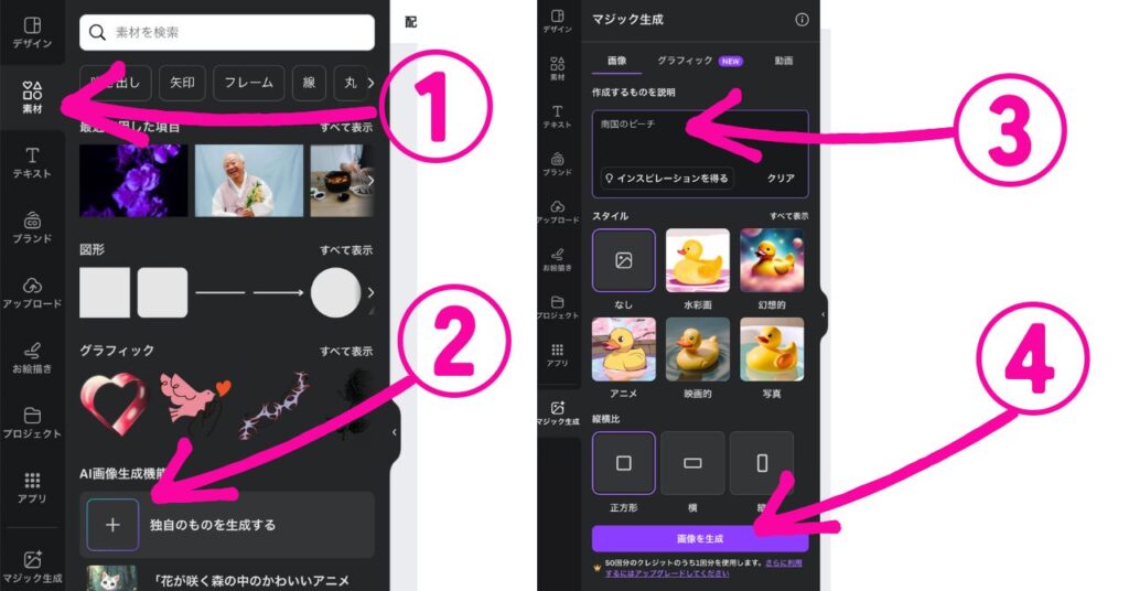 CanvaのAIで画像を作る機能はとっても便利で、文章を入れるだけで素敵な画像が簡単に作れます。